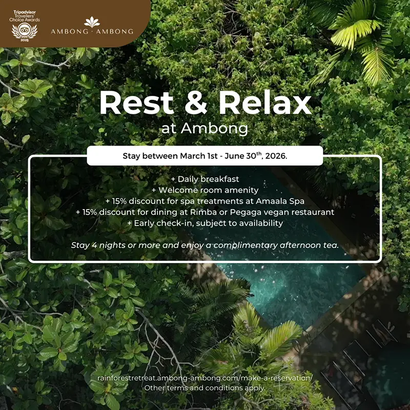 R&R at Ambong is a thoughtfully curated package designed for pure rest and relaxation, set amidst lush rainforest and tranquil island surroundings. Enjoy unhurried mornings and peaceful afternoons, whether by your private pool or on your room balcony in the rainforest, simply chilling and soaking in the calm. Indulge in moments of rejuvenation and let the serenity restore you.